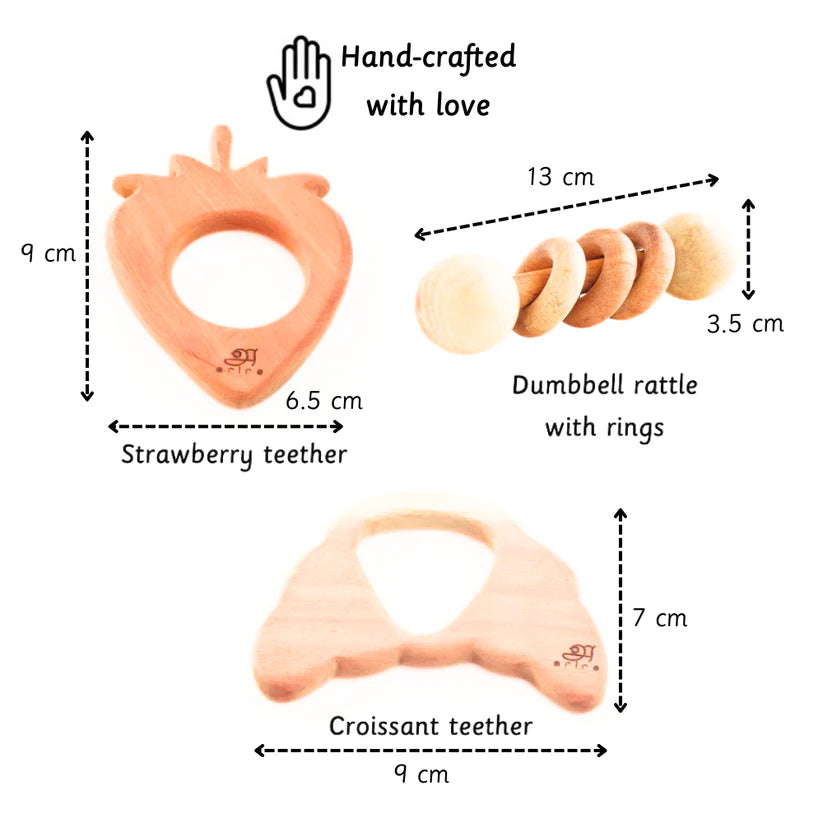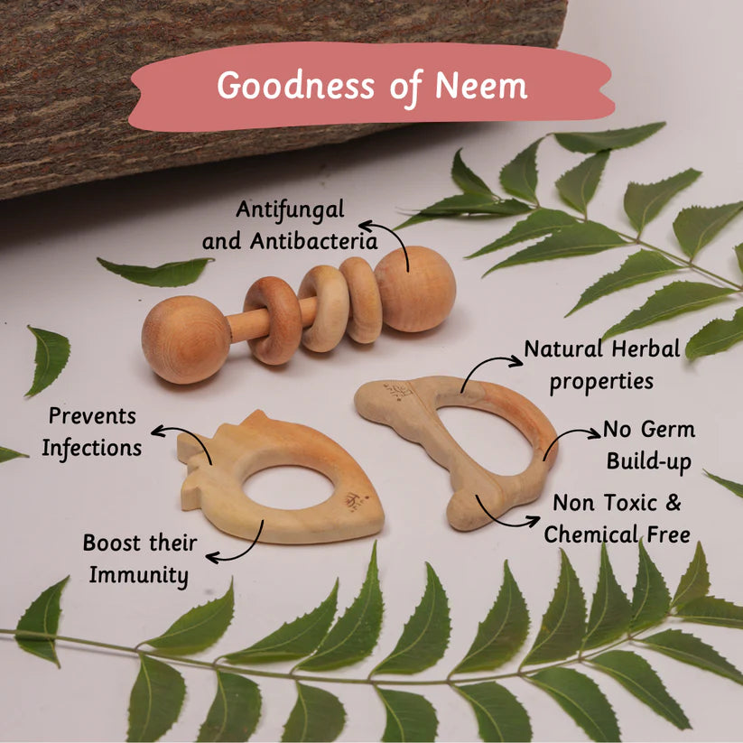 - We take delight in creating neem wood teethers, which are the first of their kind in the world. We source the best neem wood, which has been naturally aged for years to provide its medicinal benefit and is softly weighed for children to comfortably hold and put in their mouths. This includes a pair of teethers and a rattle, the perfect way to introduce a baby to wooden toys. Made of Neem wood, this gift box is ideal to be gifted for a loved one you are visiting.