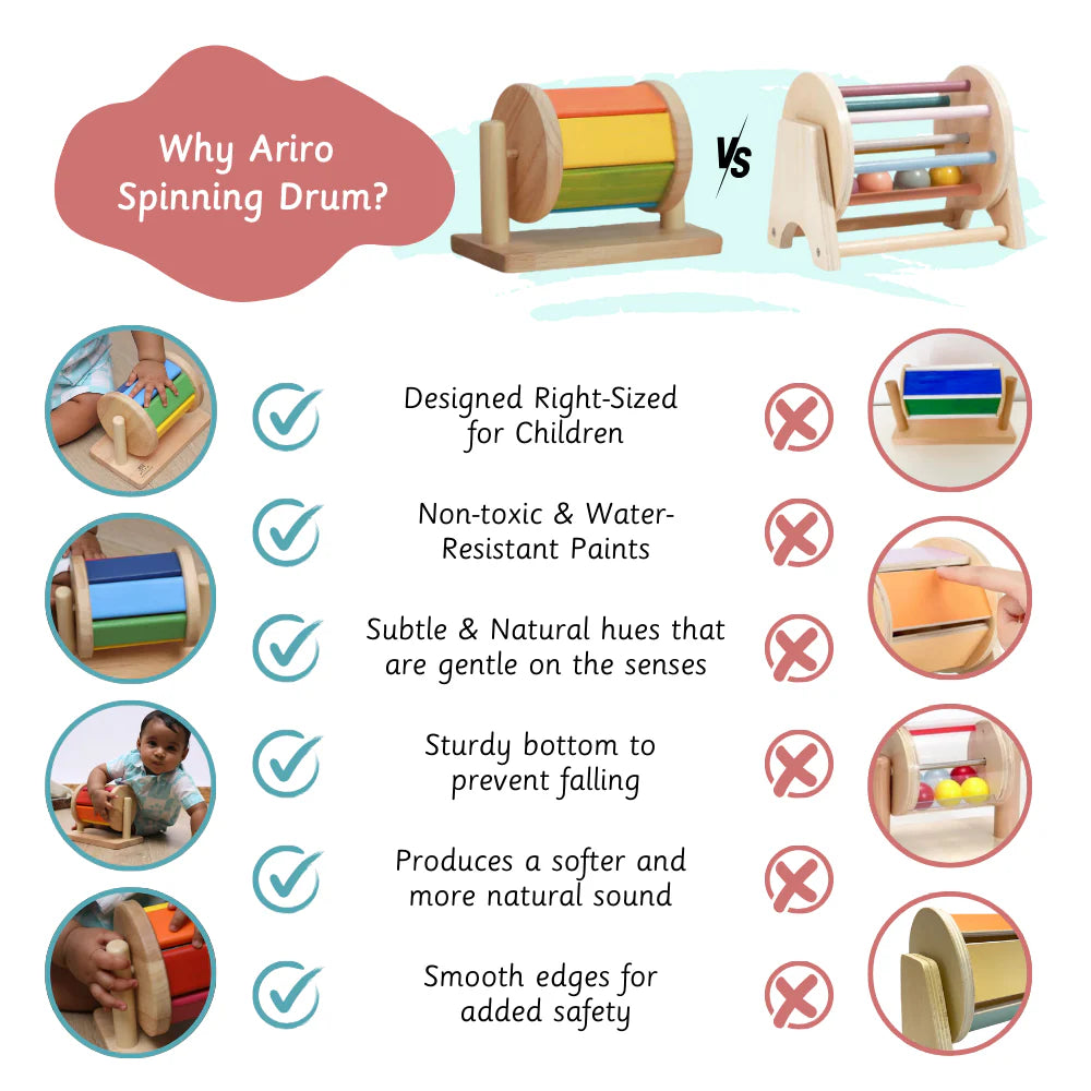 - As your child concentrates on placing their palm on the drum to spin or tap on it, it improves hand-eye coordination.