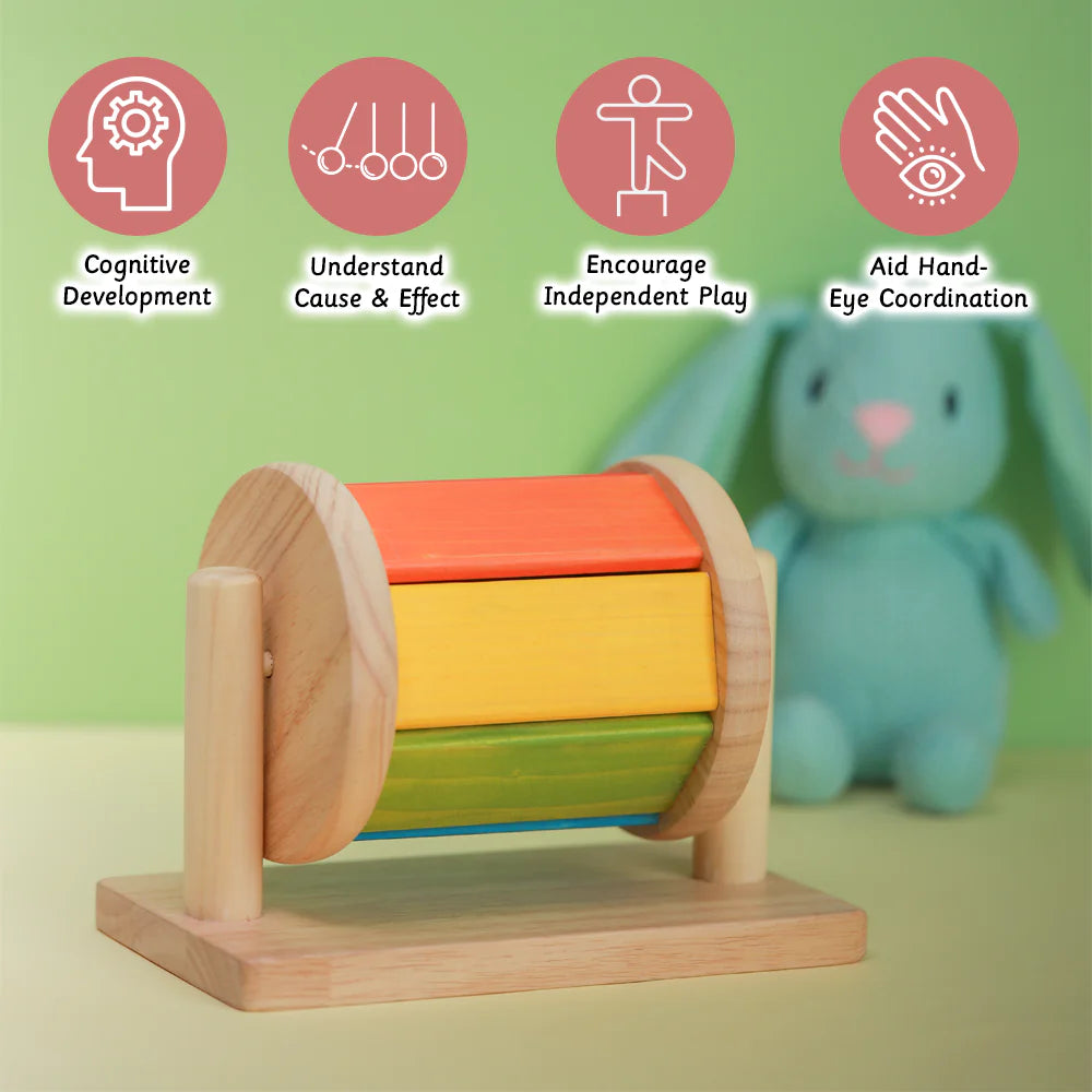 Spinning drum is an ideal toy to enable the child to exercise their core muscles and wrist rotation. As the child uses this toy from lying on their tummy to playing while sitting up straight, their relationship with it could last quite a while. The wooden balls inside the drum ensures to keep their curiosity intact.