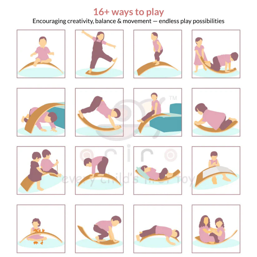 Balance board can be used to balance the body in a position which in turn helps exercise the muscles. Balance board can be used as a rocker when the child decides to sit and rock about.