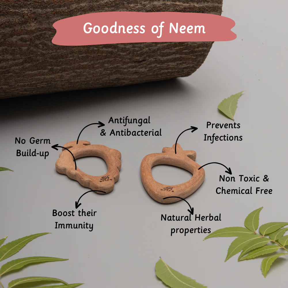These wooden teethers, Made from Neem wood, are easy to grasp, are the best for your baby’s teething needs and sooth those aching gums. This will be the perfect first toy for your baby. Neem wood is also Antibacterial and Antifungal, adding extra benefits to your child's play.